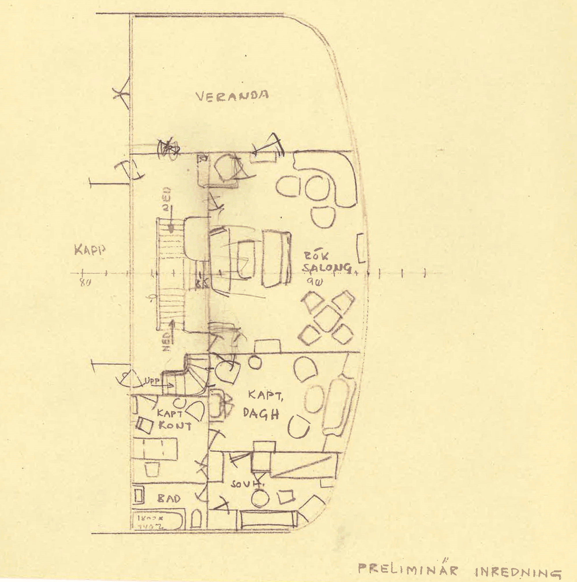 Skissen visar en preliminär skiss över inredningen och i ett dokument kan man läsa att rederiet hade en del förslag till ändringar av varvets ritningar.