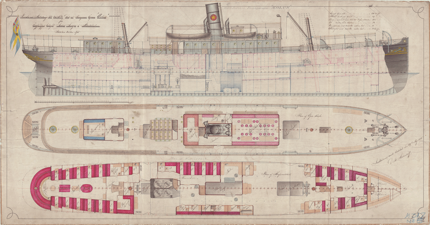 Bland ritningarna från Lindholmens Varv finns en färglagd inrednings- och slutritning som omedelbart fångar blicken. Den är daterad den 29 maj 1885 och bär namnet S/S Aeolus – ett passagerarfartyg som kom att bli något alldeles extra i den svenska ångbåtstrafikens historia.