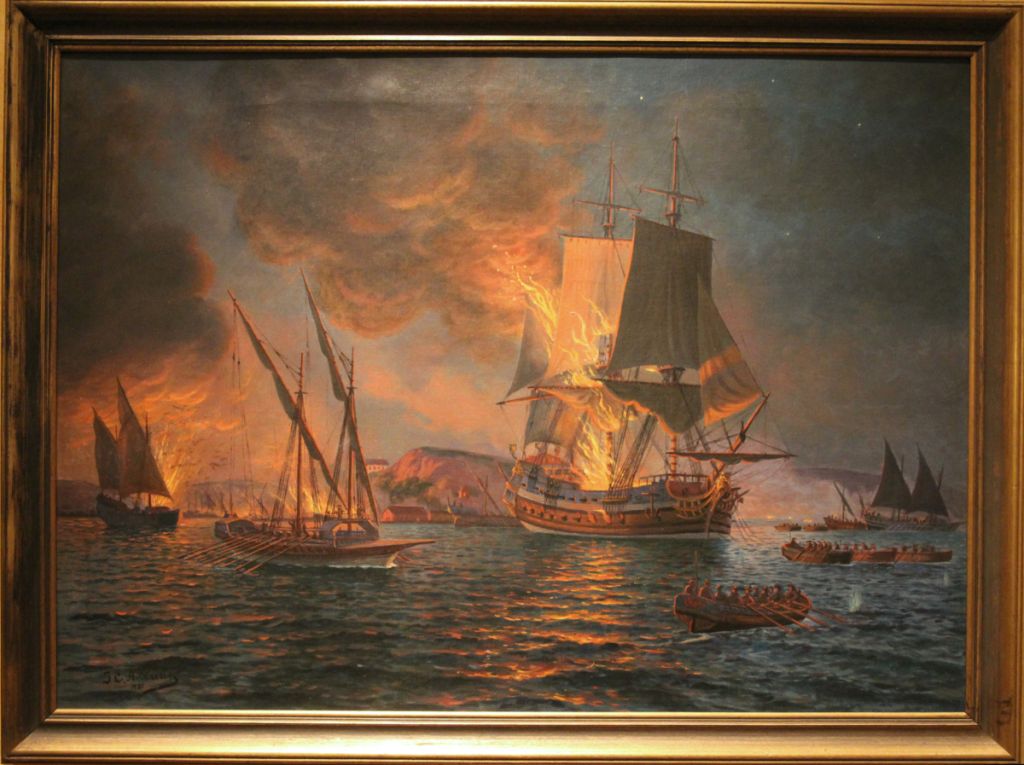 Greve Mörner brinner. Fartyget exploderade strax därefter och sjönk till botten. Sjöfartsmuseet har en del föremål från vraket och tavlan visas på museet.