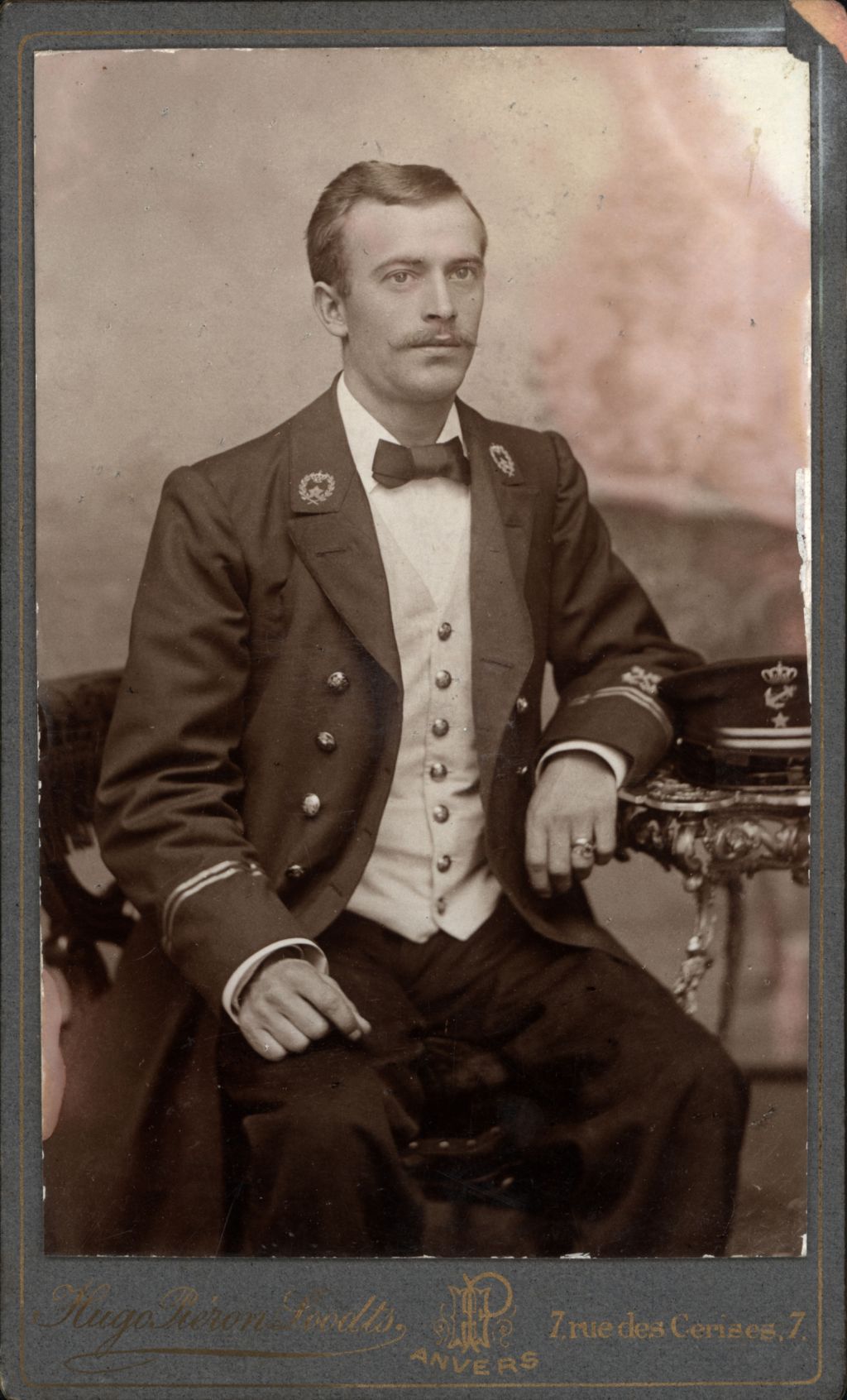 Gustaf Wilhelm Nilsson föddes den 6 oktober 1875 i Göteborg. Han bosatte sig efter andra världskriget i Lerum med sin familj och där bor han fram till sin död 1963. Fotografiet är taget i Antwerpen hos Photogr. Maritimes Hugo Piéron Loodts.