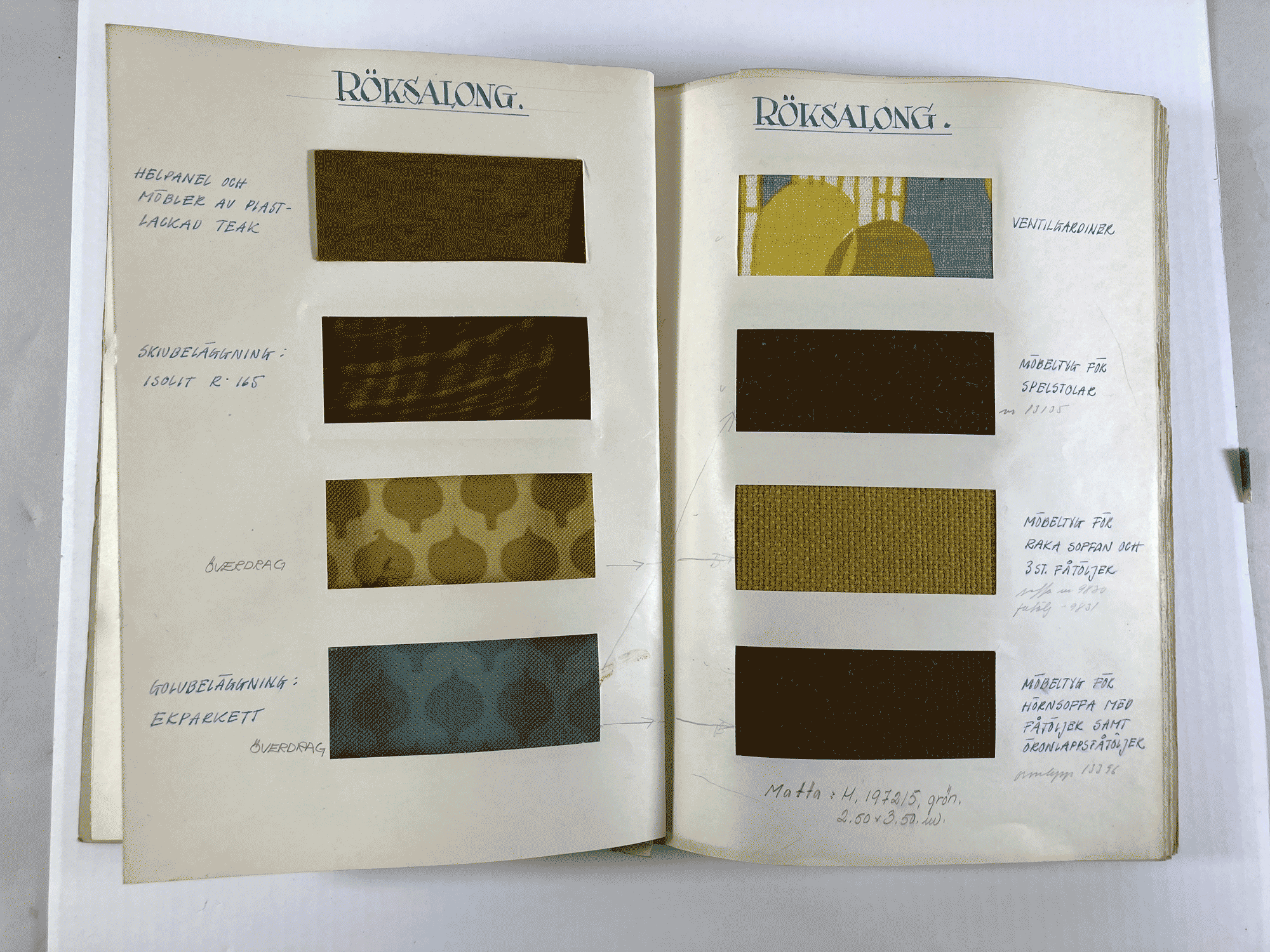 De svartvita fotografierna av inredningen tagna i samband med leveransen blir mer intressanta när man samtidigt kan se och känna på materialproverna.
