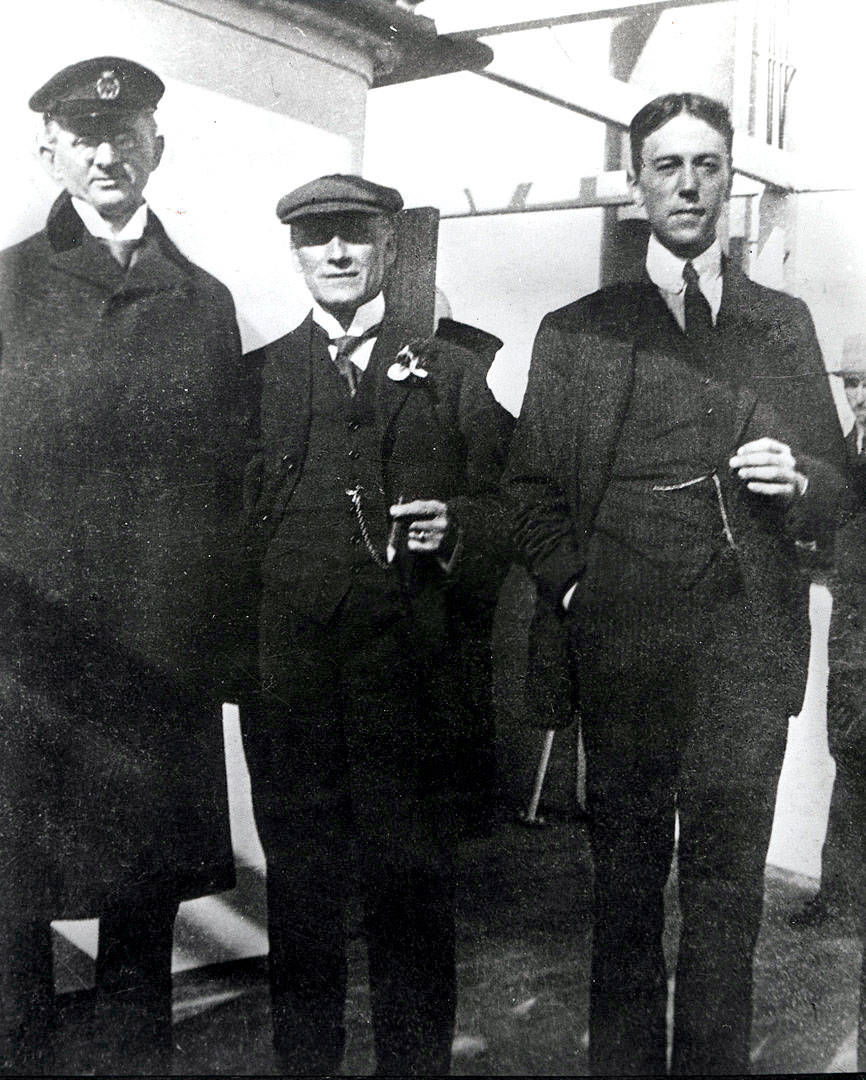 Dan Broström, Hugo Hammar och Gunnar Carlsson ombord på lastfartyget BULLARENS provresa 27 juni 1918. Broström var styrelseordförande och Hammar verkställande direktör i Götaverken, som byggt BULLAREN. Carlsson var verkställande direktör för Rederi AB Transatlantic, som var fartygets beställare.
