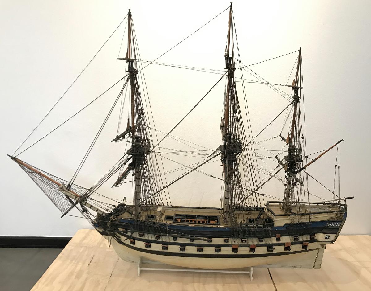Modellen är gammal, vi vet inte hur gammal. Den föreställer ett större örlogsfartyg från mitten av 1700-talet, kanske är modellen från samma tid. (Om ett ord börjar med örlog handlar det om något militärt till sjöss. Ett örlogsfartyg är alltså ett militärt fartyg.) Troligen föreställer den fartyget Prinsessan Sophia Albertina som byggdes i Stockholm 1757–1766. Skeppets uppgift var att ingå i sjöslag genom att ligga i linje med andra skepp och skjuta kanonskott mot fienden.
