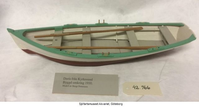 Modellen är byggd 1987 av Bengt Pettersson, efter en riktig doris som roddes mellan Kyrkesund och Härön av en Axel Hermansson, någon gång på 1930-talet.